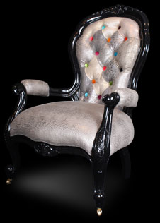 We can paint the carved frame for you in almost any pantone paint colour to achieve a unique one-off piece. Black is the favourite paint colour for this patchwork chair. Would you prefer black buttons instead of multicoloured buttons?
